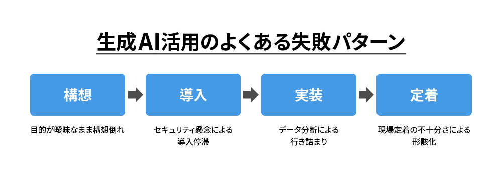 「とりあえず流行っているからPoCをやってみよう」「どのツールが一番賢いか比較しよう」といった入り方をして、行き詰まってしまうケースです。肝心の「何を解決するためにAIを使うのか」という目的が定まっていないと、部門ごとに期待値が異なり、全体像が揃わず構想倒れになってしまいます。