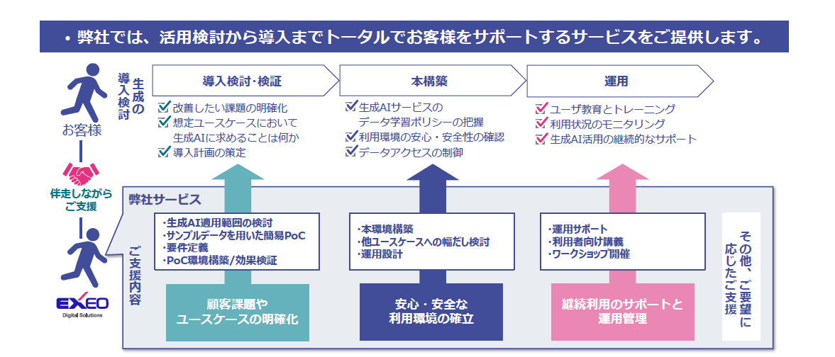 ここまで見てきたように、生成AIの全社展開には「活用基盤」と「運用支援」を両輪で設計する視点が重要です。こうした考え方を実装まで一気通貫で支援するのが、エクシオ・デジタルソリューションズ(以下、EDS)の「生成AI活用基盤提供サービス」です。生成AIの適用範囲検討からPoCの実施、導入後の運用支援、活用促進までを一貫してサポートいたします。