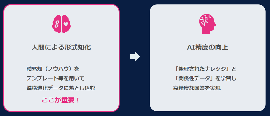 また、規則性のあるデータは、AIにとっても理解しやすい点がメリットです。AIが情報を正しく読み取るためには、ドキュメントを構造的に分割する「チャンク化」が有効ですが、テンプレートを利用すれば自然と情報のまとまりが明確になります。結果として、誰がナレッジを書いても同じ品質・フォーマットになり、人間とAIの両方がナレッジをスムーズに理解できます。