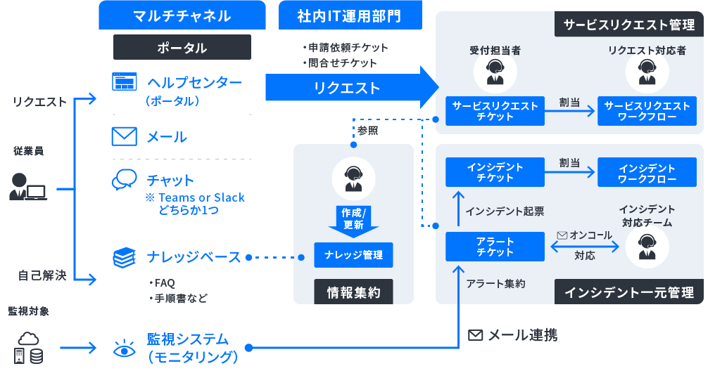 ひとつのプラットフォームで複数のチーム間の業務を統合的に管理し、リクエストを効率よく処理します。サポート依頼はサービスデスクを通じて簡単に受け付けでき、直感的なポータルで操作もスムーズです。