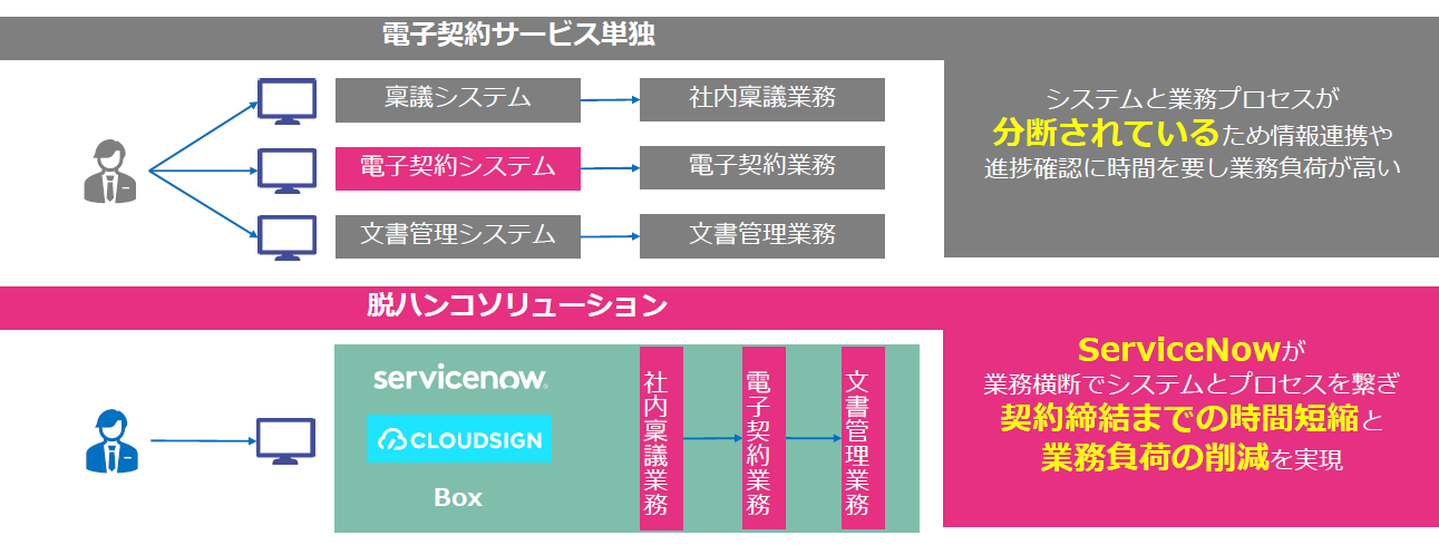 本章では、電子契約サービスであるCloudSign(クラウドサイン)と、ワークフロー基盤であるServiceNowの連携を例に、具体的な解決策を解説します。