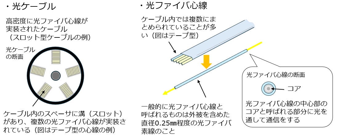 屋外に敷設される光ケーブルは通常、複数の光ファイバ心線が内部にテープ状や単線を束ねるなどして、収められています。