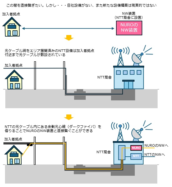 「NURO光」を自社の独自ネットワークでサービス展開したい、しかし所有する光ケーブル設備がありません。では、どうするのか?加入者の開通申し込みがある度に、その都度光ケーブルを敷設するのか?それでは費用やサービス提供までの時間的にも全く現実的なことではありません。