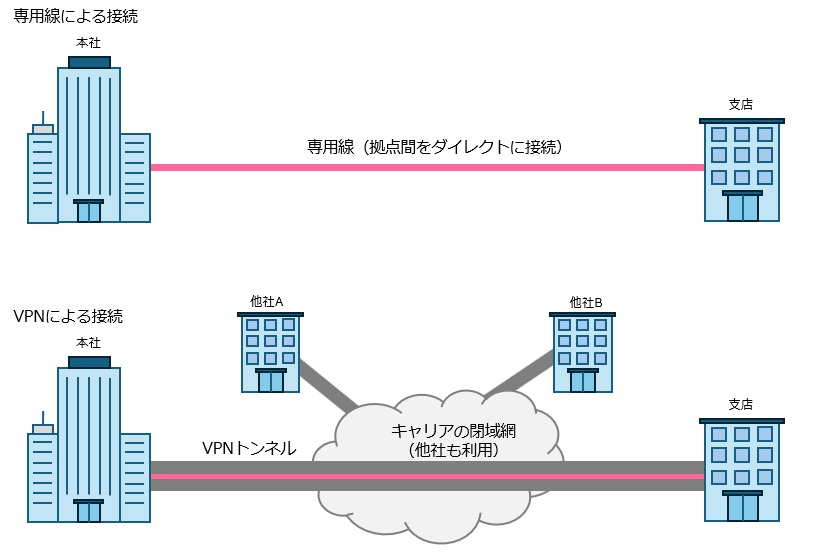 つまり、VPN は「柔軟に拠点をつなぐ手段」として優れており、特にコスト重視・多数拠点接続・モバイル/リモートワーク併用の場面でメリットがあります。