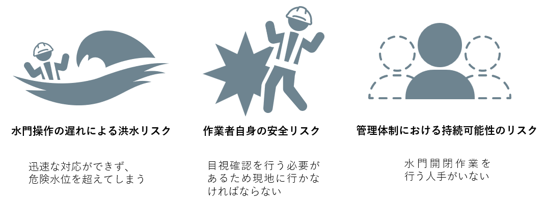 気候変動による豪雨災害の増加は、以下のようなリスクが、従来の管理体制に大きな負荷をかけています。